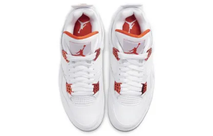 If you're looking for something simplistic yet timeless, look no further as the Nithtke Air Jordan 4 Retro Metallic Pack has got you covered. Dressed in all white, the upper is constructed with leather and grid mesh. Underneath is a white rubber sole. Touches of Total Orange grace the eyelets, heel, tongue and sole.